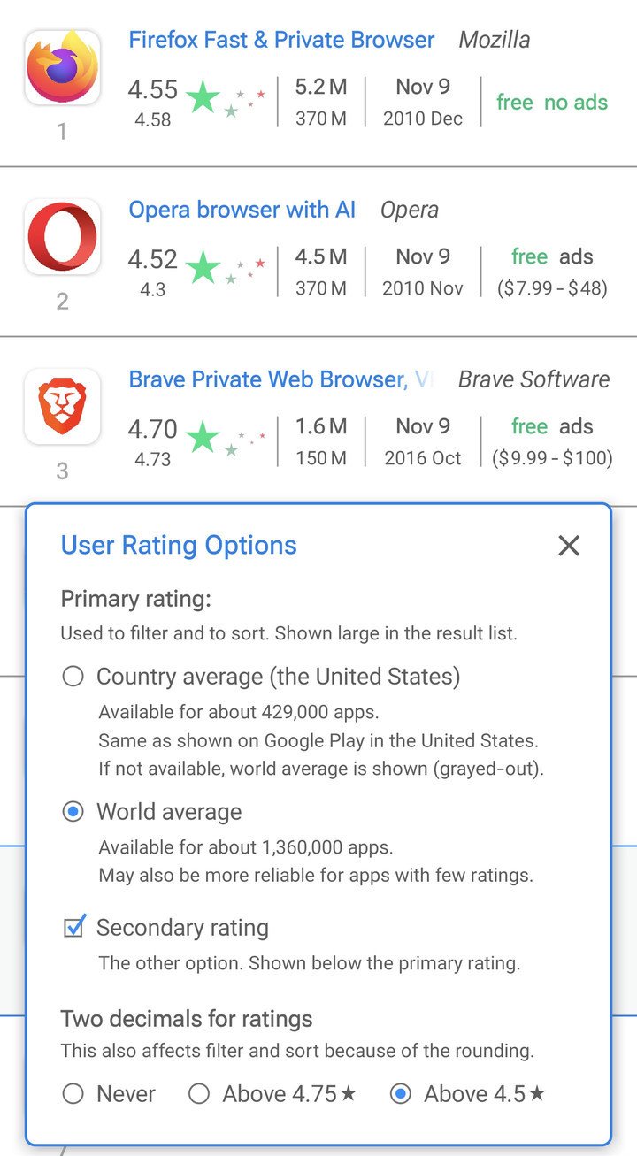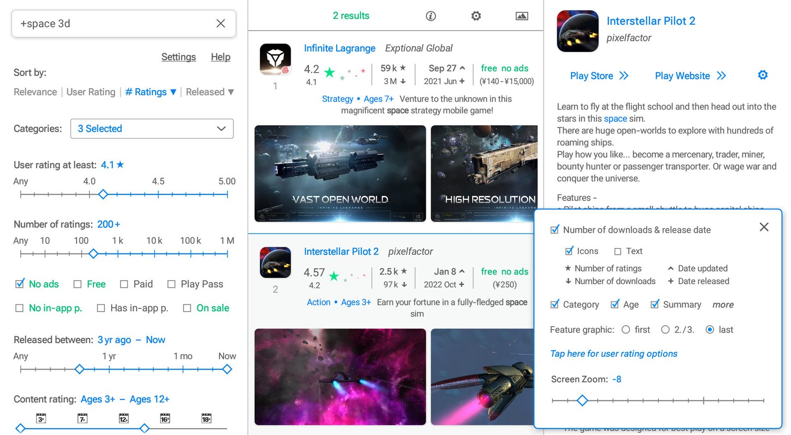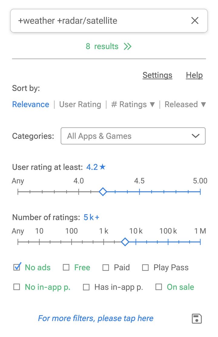 To discover less-known apps, you can also filter for app with few ratings or downloads.